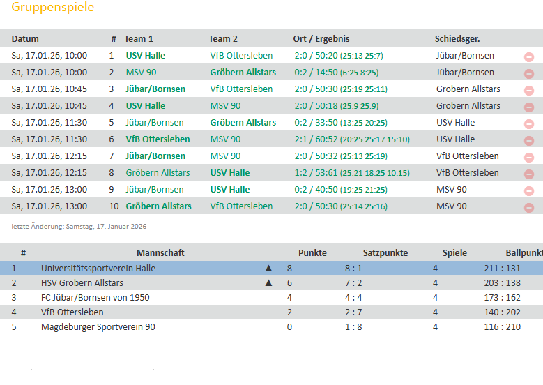 Landesmeister in der Altersklasse Ü35 Herren wurde der USV Halle. Herzlichen Glückwünsch. Aber auch der Zweitplatzierte HSV Gröbern darf sich freuen. Beide Mannschaften haben sich für die Nordostdeutschen Meisterschaften qualifiziert. Eine der beiden Mannschaften darf das Turnier am 15.03.2026 ausrichten.
